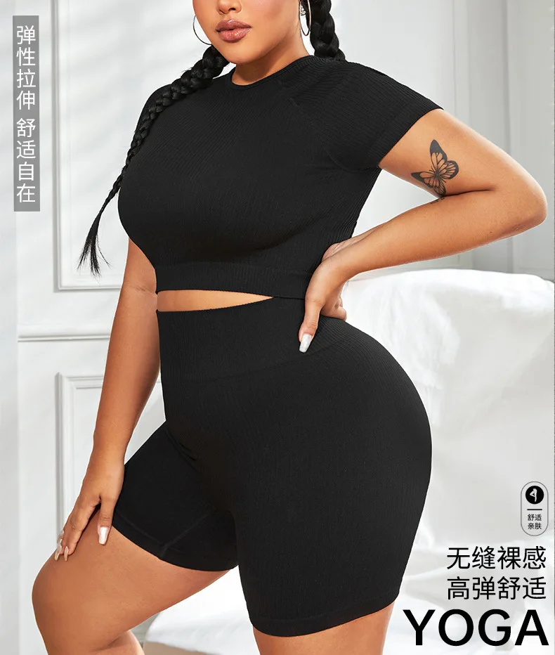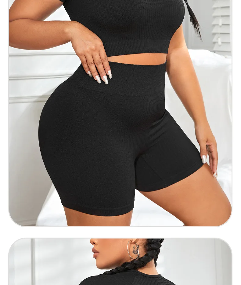 Step into summer with the PLUS Curvy High Waist Yoga Set! This playful black set features a sleeveless top with built-in chest pads and matching high-waisted shorts, designed to fit larger than usual for extra comfort. Made from a breathable, quick-dry fabric blend, it keeps you cool and fresh while you move. The knit construction resists pilling, making it perfect for all your yoga adventures. No pockets—just pure, playful freedom in every stretch and pose!