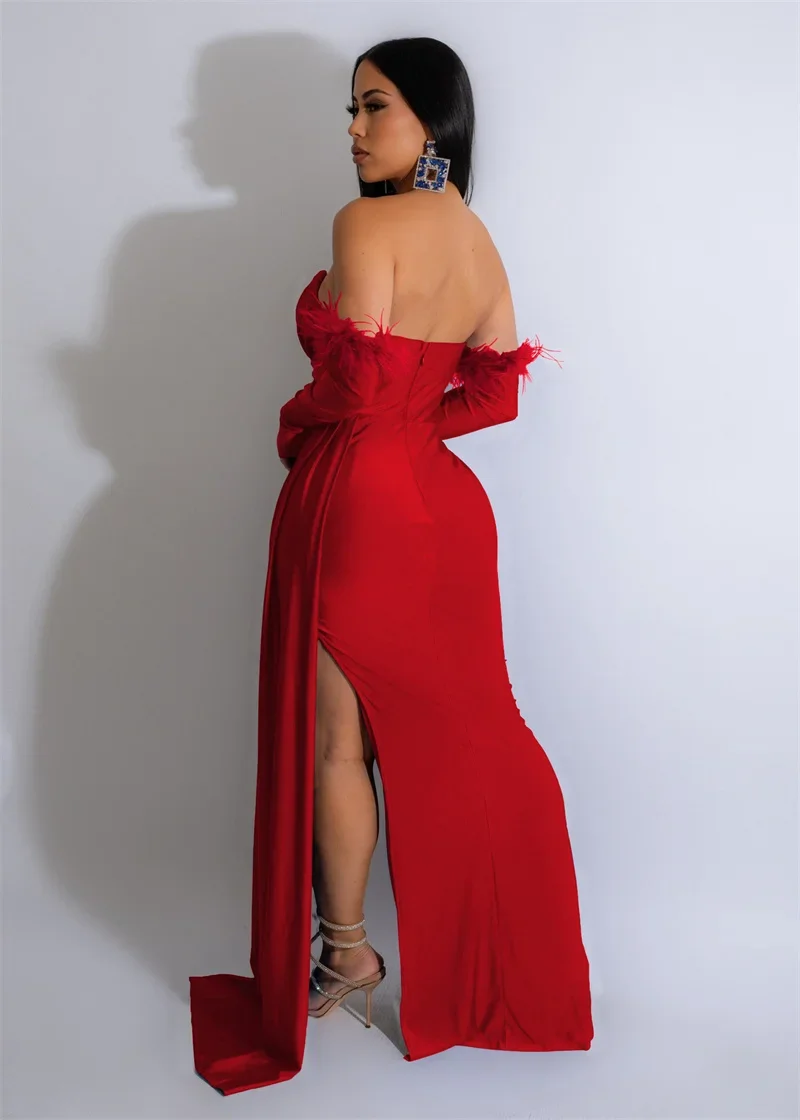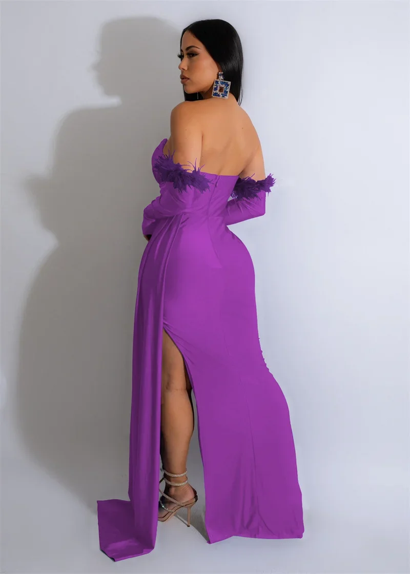 Make a splash at your next event in this stunning mermaid gown that hugs you in all the right places. Crafted from a luxe polyester-spandex blend with a hint of feathered flair, this floor-length beauty features an off-the-shoulder neckline and empire waistline for an effortlessly elegant silhouette. The high-stretch fabric moves with you, whether you're dancing the night away or turning heads at a wedding celebration. Perfect for parties, galas, or any occasion calling for serious glamour.