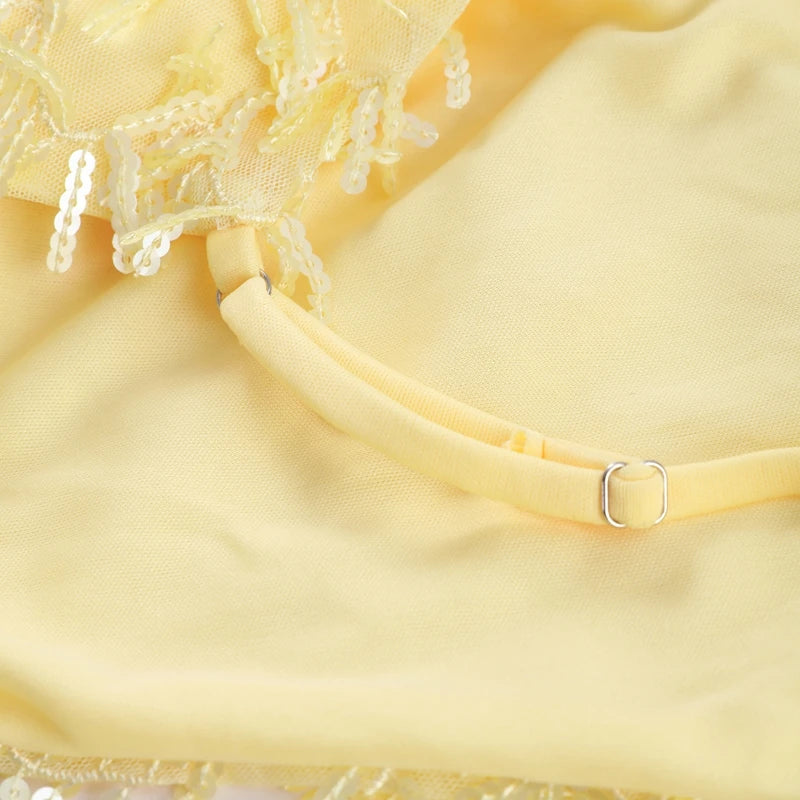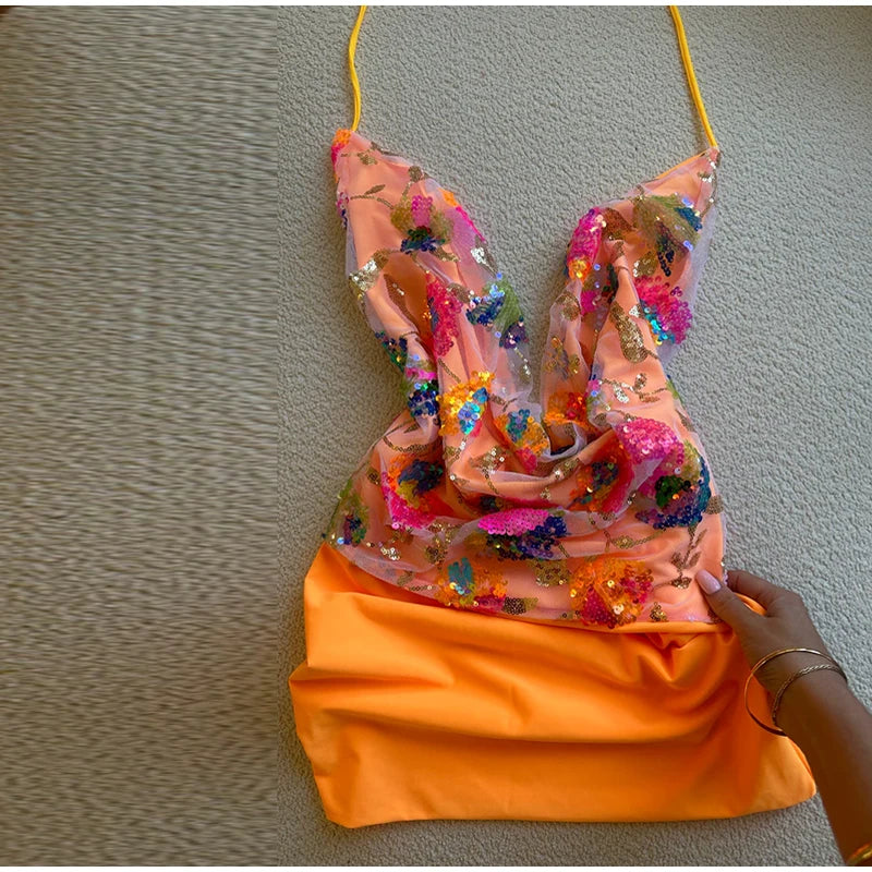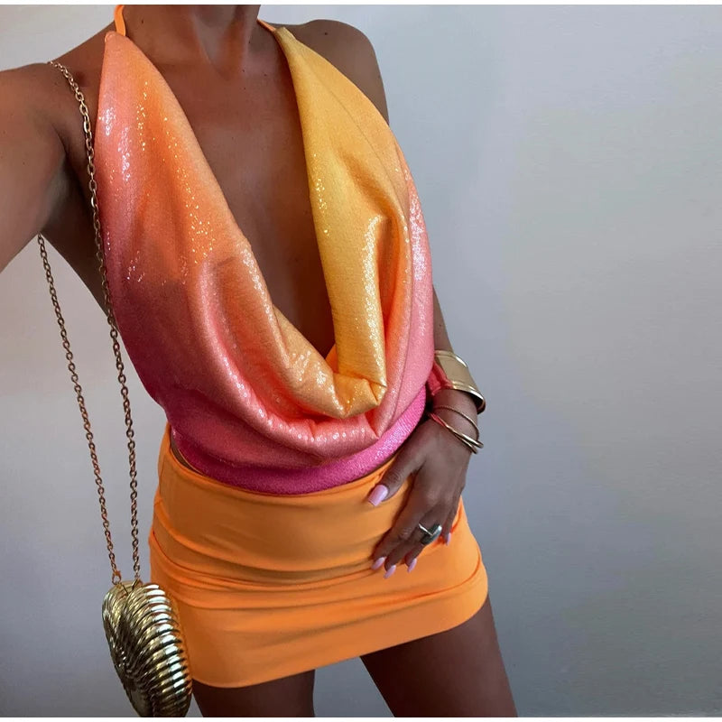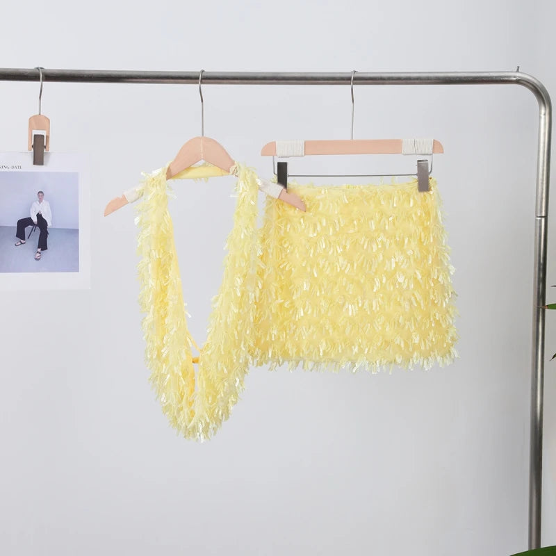 Turn heads this season with this daring two-piece sequined halter skirt set. Designed for confident women, it features a glamorous V-neck halter top and a flirty A-line mini skirt that hits above the knee. Crafted from high-quality polyester with sparkling sequins, this sleeveless outfit pulls on easily with its elastic waist for the perfect fit. Ideal for parties and spring or summer nights, this bold ensemble promises to make you the center of attention wherever you go.