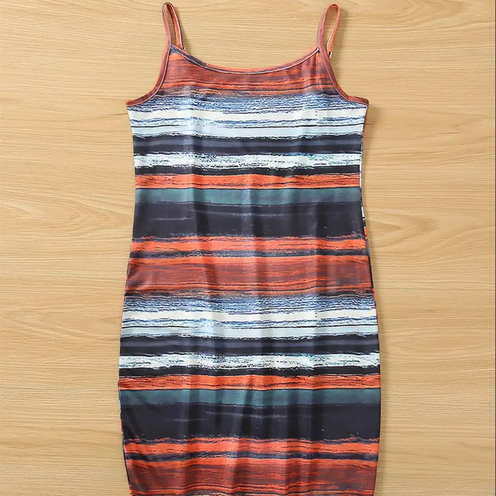 This daring Stripe Trifecta Mini Dress features a sleek slim fit with a straight silhouette and off-the-shoulder sleeves for bold summer street style. Crafted from slightly stretchy polyester knit, it offers knee-length coverage and a pullover design for effortless wear. Its natural waistline and striking print make it a standout piece ready to energize your wardrobe.